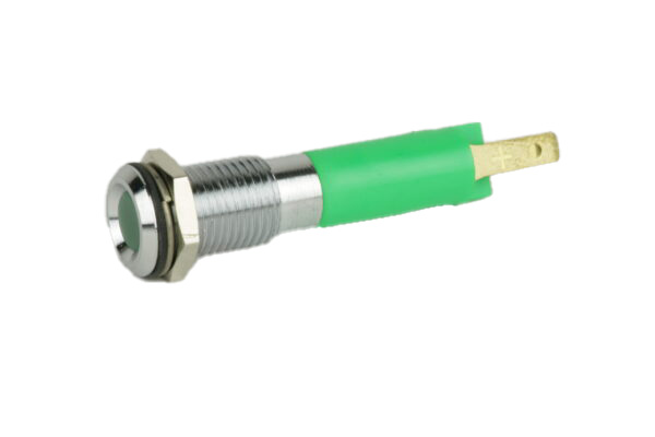 LED indicators for flush mounting, diameter 8+0.2mm are equipped with a diffuse flush 5mm LED in different colours. The connection is made by means of flat-plug connectors 2.8x0.8mm. IP67 protection degree